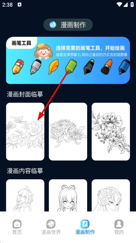 1、在漫画制作页面,选择漫画封面临摹中的图案,进入绘画页面。