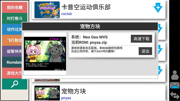 聚集了街机中经典的游戏,游戏中包括非常有名且经典的大作例如:三国战记、三国志、恐龙时代、名将、街霸、圆桌骑士、快打旋风、龙与地下城等、拳皇、合金弹头、彩京1945、魂斗罗、双截龙、雪山兄弟、神奇地带、绿色兵团、真人快打、侍魂、饿狼、月华剑士、恐龙时代、名将等等……