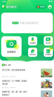 搜狗翻译app,堪称一款极为实用的翻译软件。它能助力用户迅速且精准地翻译各类语言文字,同时提供多样化的翻译方式,让用户轻松理解任何外语的释义。值得一提的是,2023 安卓版的搜狗翻译配备了权威外语词典,可供用户无限次查阅,还提供大量优质文章。有需求的朋友们,赶紧来体验搜狗翻译吧!