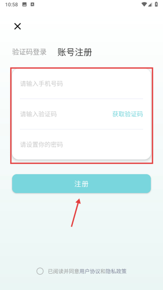 4、于账号注册页面,填入手机号、验证码并设定密码,勾选协议后点击注册按钮,即可完成账号注册操作。