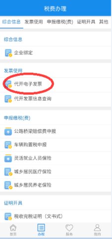 2、在新打开的页面中,选择并点击办税功能下的【代开电子发票】选项。