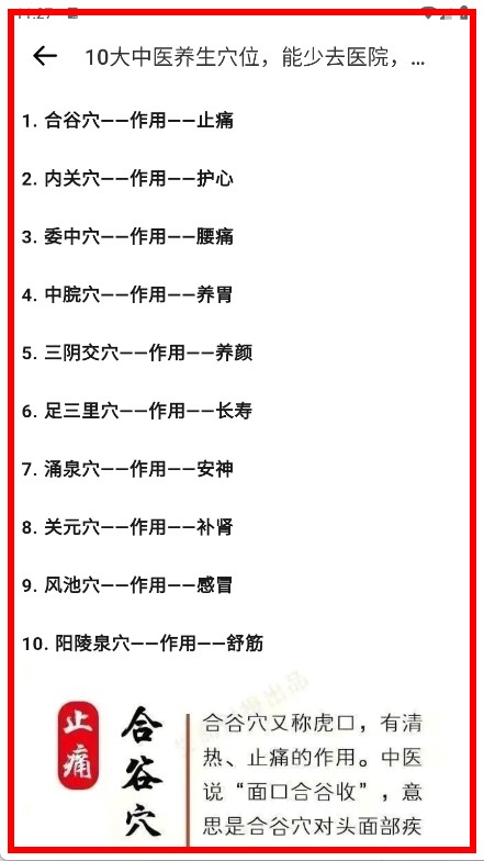 4、进入该内容的详情页面,查看10大中医养生穴位及其作用等知识。