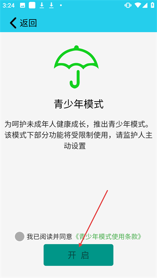 3、进入【青少年模式】页面,勾选【我已阅读并同意《青少年模式使用条款》】后点击【开启】。