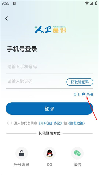 3、在手机号登录页面,点击新用户注册选项,进入新用户注册页面。