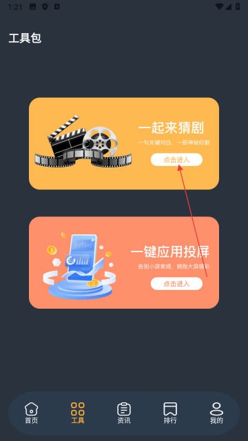 2、在工具包页面,点击一起来猜剧的【点击进入】,进入猜剧页面。
