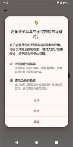 2、为防止弹窗信息被状态栏遮挡,可点击下方的“无障碍未开启”按钮,跳转至无障碍设置页面,并为灵动鸟安卓版开启无障碍权限。