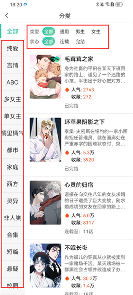 4、在【分类】板块,会按照不同题材类型和更新状态对所有漫画进行细致划分,方便用户快速筛选所需内容。