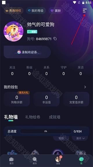 1、首先,在平台创建聊天房需完成实名认证,用户可进入应用的【我】页面,点击右上角的扩展功能图标(即下图红色箭头指向的图标)。