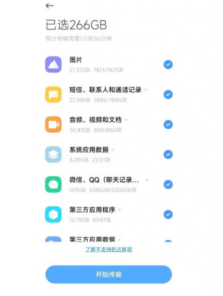 ②小米手机向其他品牌手机传输数据时,仅支持导入照片、联系人、短信等内容;若需传输微信或其他聊天记录,则需另外单独进行二次传输操作。