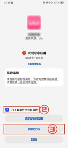 2.再次点击该apk文件进行安装,随后点击【了解风险】选项,勾选【已了解此应用存在风险】的复选框,接着点击【仍然安装】按钮。