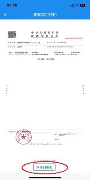 7.若需要凭证,可在上一步操作中点击“打印完税凭证”,接着点击下方的“保存到相册”,这样就能将完税证明保存至手机了。