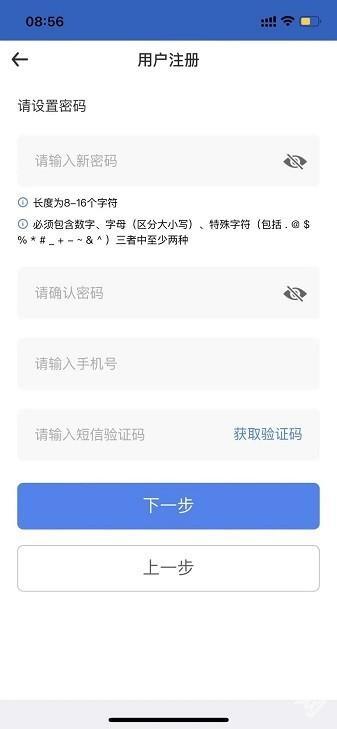 4. 按要求设置密码(点击设置密码旁的眼睛图标可显示输入的密码),填写手机号并获取验证码,然后点击【下一步】