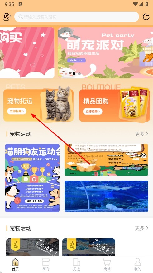3、活动医疗参与:关注平台活动板块,选择适合宠物的聚会或训练活动报名,宠物需医疗服务时,在线预约合作医院,按预约时间带宠物前往就诊即可。