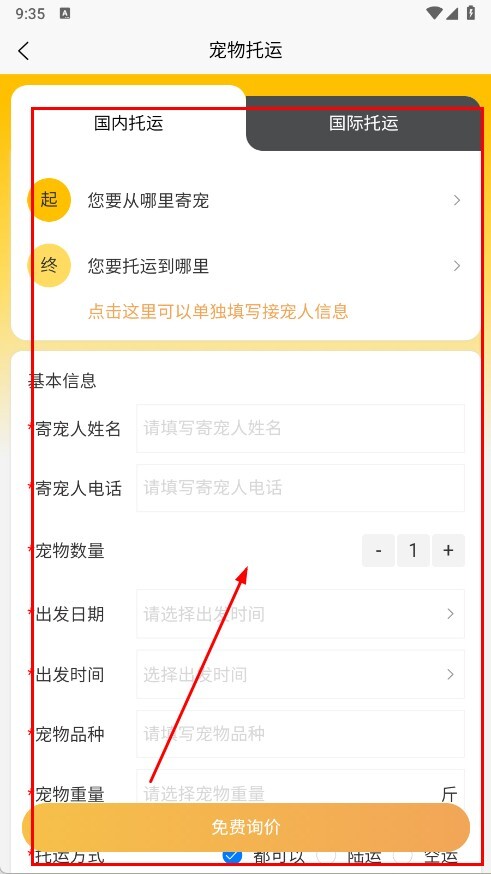 2、登录后回到首页,点宠物托运,进入服务页选国内与国际托运,填寄宠起终点、接宠人、宠物及寄宠人信息。