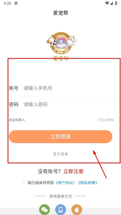 1、打开爱宠帮,在登录页填手机号、密码,点立即登录,也可选暂不登录体验部分功能。
