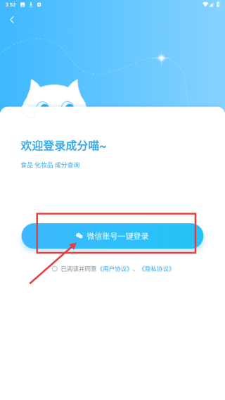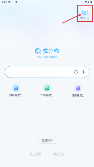 1、打开成分喵应用,点击右上角个人中心选项,进入登录相关页面。