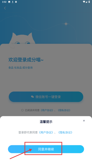 3、在弹出的温馨提示窗口,点击同意并继续按钮,完成登录操作。