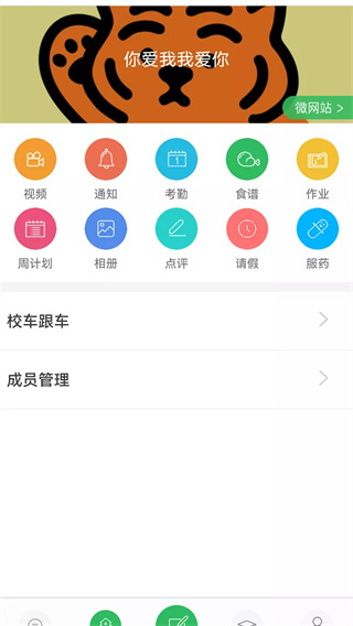1、启动软件后,首页设有考勤、食谱、作业、相册、视频等功能模块。