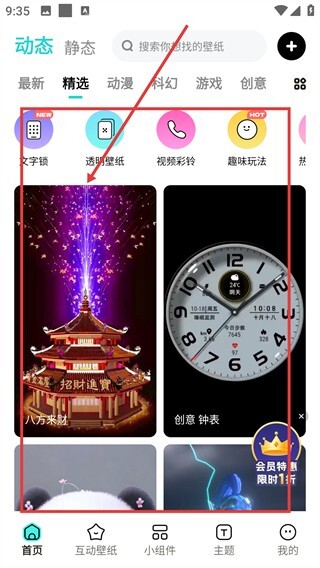 1、打开壁纸应用的精选页面,找到【创意钟表】类的动态壁纸,这类壁纸呈现的表盘样式包含天气和步数信息,点击即可进入详情页面。