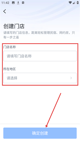 4、进入门店创建页面后,填写【门店名称】并选择【所在地区】,确认信息无误后点击【确定创建】按钮,即可完成门店的创建操作。