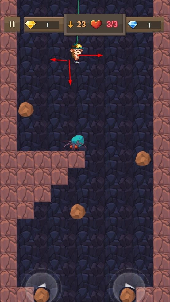 2、操控角色左右移动,躲避蜘蛛等敌人,在向下挖掘的过程中,收集蓝色钻石、黄色钻石等资源,同时留意生命值爱心标识,避开尖刺等危险障碍。