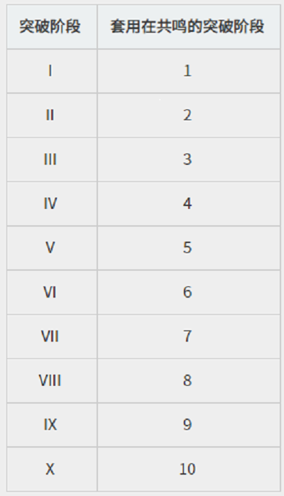 - 装置于协调炼金石中的混沌炼金石:从突破阶段I至X,突破、激烈、幸运皆以共鸣对象为套用标准,各突破阶段在共鸣等级上所套用的数值如下。