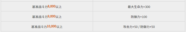 - 按照角色的基准战斗力,达成特定战斗力时可以额外获得增益效果。