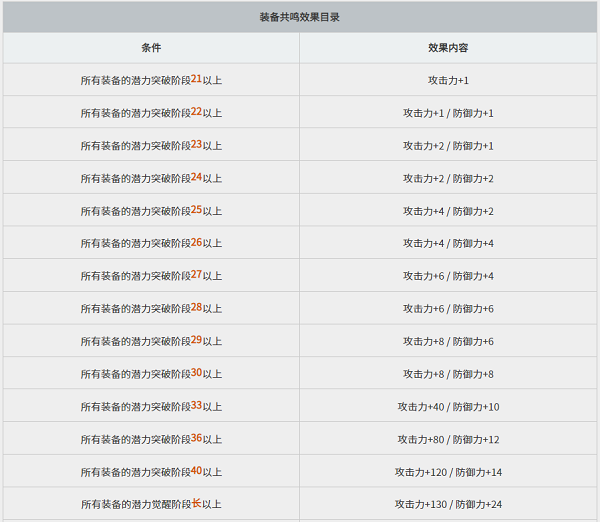 - 当穿戴齐主武器、辅助武器、头盔、盔甲、手套、鞋子这6种所有栏位的装备时,依据潜力突破(潜力觉醒)阶段中最低的那个阶段,能够获取额外的战斗力。