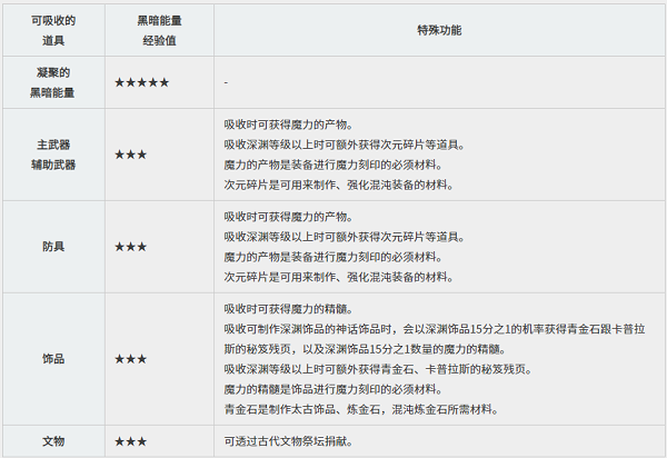 可通过吸收装备、饰品、文物等物品获取所需经验值。凝聚的黑暗能量是黑精灵专属的成长物品,能提供颇为可观的经验值。