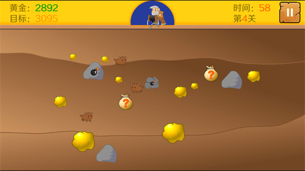 3、经典的游戏玩法,利用钩子去抓住各种物品,不断的提高自己的财富。