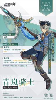 青岚骑士,攻击型职业。攻守兼备、可进可退、输出有效、能力均衡,在各种战斗环境之下都有着不俗的作战表现。