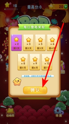 1、领取登录奖励 进入游戏后首先会看到每日登录奖励界面,点击界面下方的确认按钮即可领取当日福利。累计登录的天数越多,能获得的星星数量就越丰厚,这可以为后续的玩法提前储备资源。