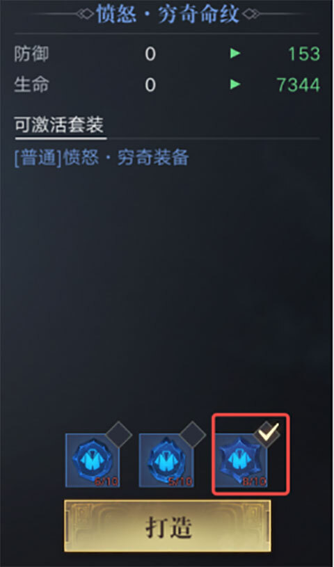 为什么有红色命纹不能用?原因就在这里了,是需要按品质依次从低到高进行打造。如图所示,需要十个同类型的命纹结晶即可打造一个!