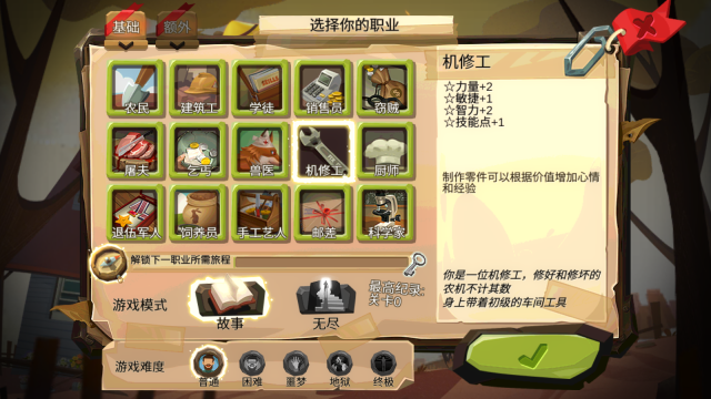 游戏开始后,我们需要先选择一个职业,右侧会展示该职业的详细介绍和属性面板,确认选择后就能进入游戏了。