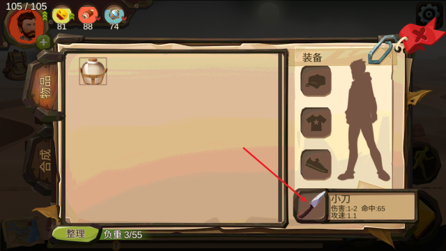 4、例如这里,我们通过翻找事件找到了一把小刀,我们可以点开背包后将其装备上。