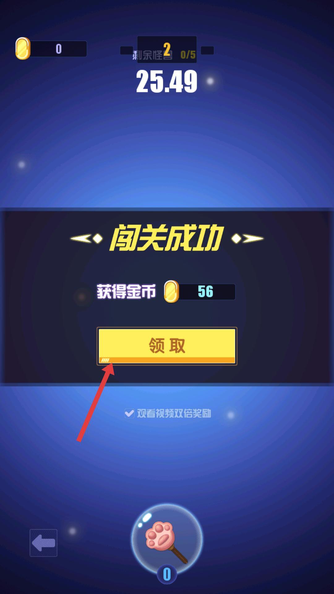 3、闯关成功后,点击领取获取金币奖励,可选择观看视频翻倍,积累资源用于升级。